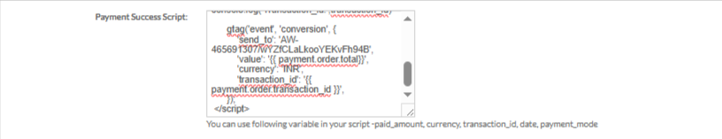 • You can use predefined variables in the script such as paid_amountcurrencytransaction_iddate, and payment_mode to capture detailed payment information.