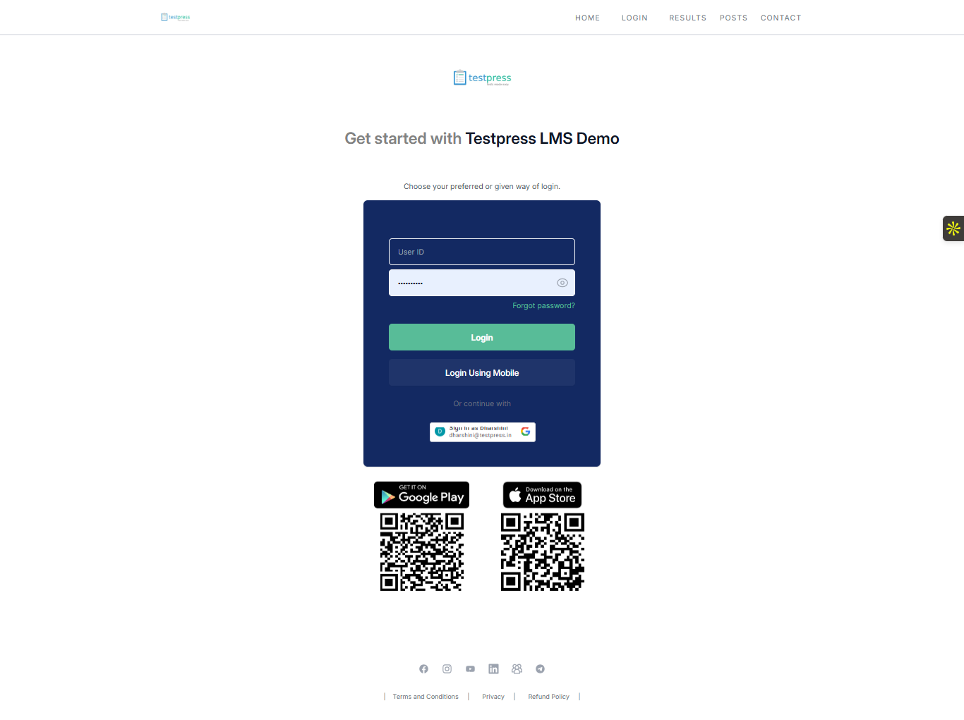 Once saved, the added social media links will appear on the login dashboard footer of the Testpress LMS.
